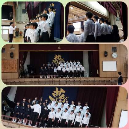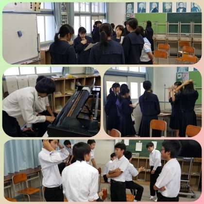 音楽室では、パート練習に余念がありません。円になりリズムを取りながら練習する女子グループ。男子は、歌詞等の確認でしょうか、打ち合わせ等を行っています。