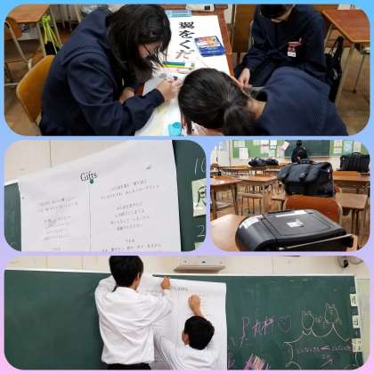 別の教室では、課題曲と自由曲のタイトルを大きく書いています。舞台用のめくりを作成していました。