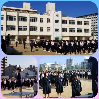 爽やかな快晴の朝、全校集会を行いました。