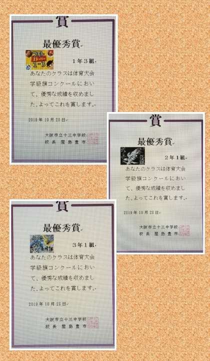 先週の文化発表会で、体育大会の応援旗の投票があり、各学年の優秀賞を表彰しました。
