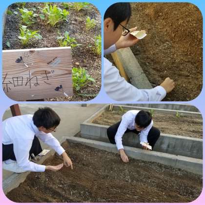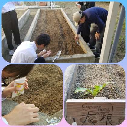 放課後、園芸部が事前(17日)に作られた畝に種まきを行っていました。