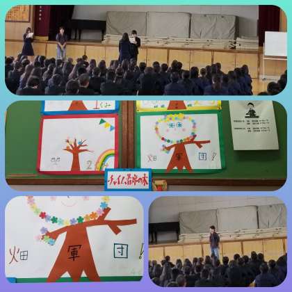 2年生の学年集会では、チャイム着席の表彰がありました。4組が着席率が高く表彰されていました。