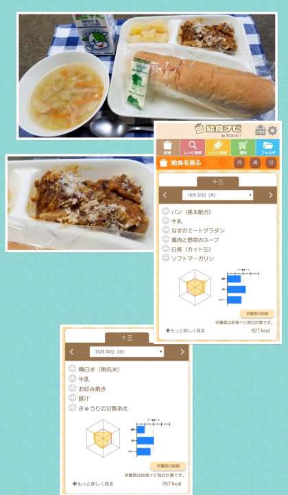 10月最後の給食は、なすのミートグラタンでした。茄子の苦手な生徒にも食べやすく味付けされ、パンとの組み合わせもバッチリでした。