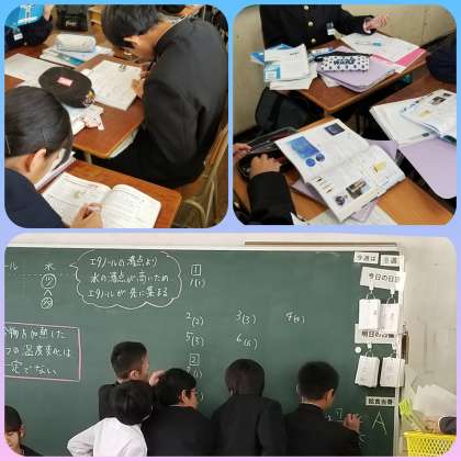 1年2組の理科では、『蒸留』についてプリントで確認をします。