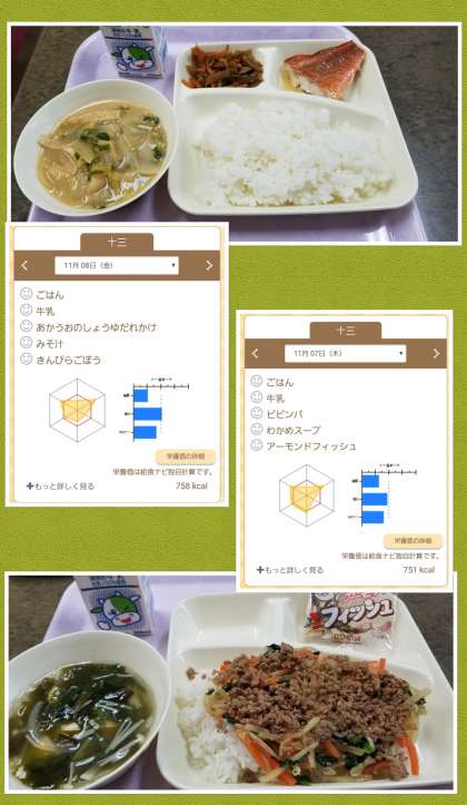 給食、昨日は『ビビンバ』。今日は『あかうのしょうゆだれがけ』。