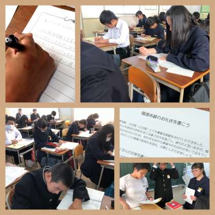 昨日の6時間目に、先日職場体験でお世話になった事業所の方々に向けてのお礼状を作成しました。