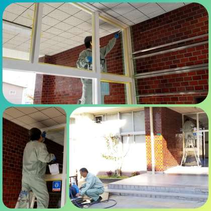 玄関扉枠の塗装を行う管理作業員。直接雨や日差しは当たらないものの、長年の劣化は否めません。塗装が剥げ、錆や汚れが目立ってきました。白色できれいに塗装を行います。