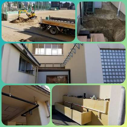 一方運動場の片隅では、業者による水道工事が行われています。ユンボーが土砂を掘り起し、水道管へ手を加えます。