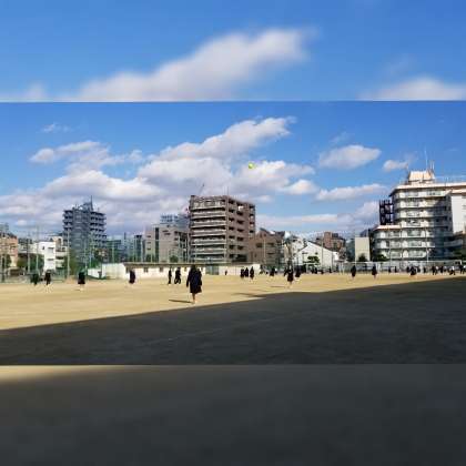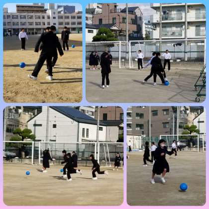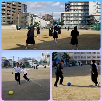 昼休み、生徒たちは元気に運動場で球技を楽しんでいます。