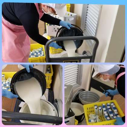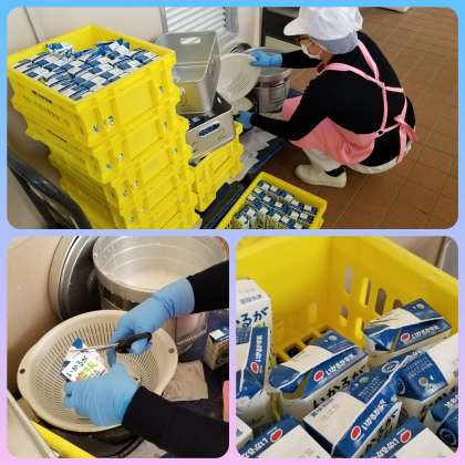 給食後の配膳室では、飲み残した牛乳をパックから全て抜く作業をしていました。毎日飲み残しの量を量ります。
