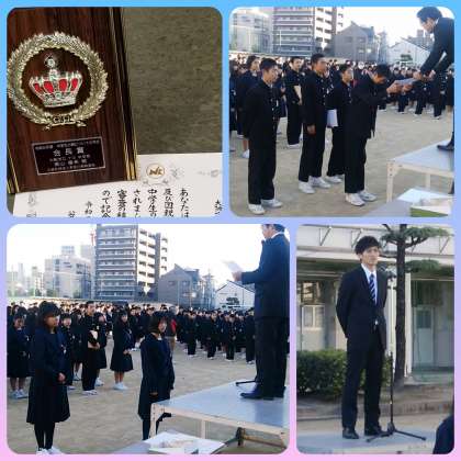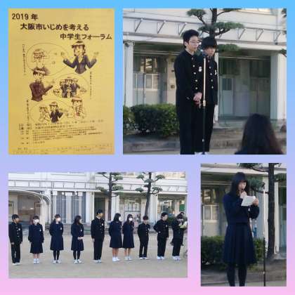 生徒会からは、昨日阿倍野区民センターで開催された『大阪市いじめを考える中学生フォーラム』で決議されたスローガンの紹介がありました。