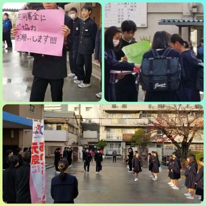 生徒会が中心になり、赤い羽根共同募金が始まりました。本校生徒500名余りの生徒の少しずつの協力金が、高齢者、障がい者などを支援するさまざまな福祉活動や、災害時支援に役立てられます。