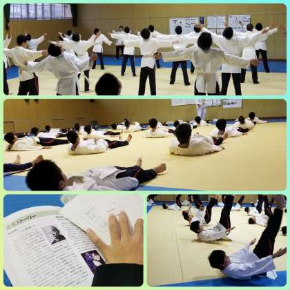 柔道の創始者である嘉納治五郎先生の写真や胴着の着方、学習内容などが壁に掲示され、生徒の興味関心を高めるための演出がされています。