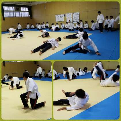 後方受け身、横受け身、前回り受け身など、繰り返し行い技術の定着を図ります。