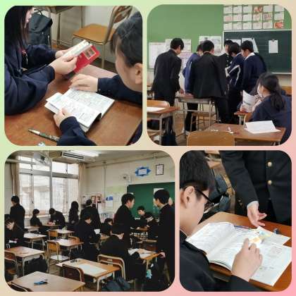 休憩時間の教室では、参考書等を開き、友人とリラックスした時間を過ごしていました。