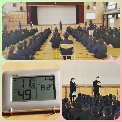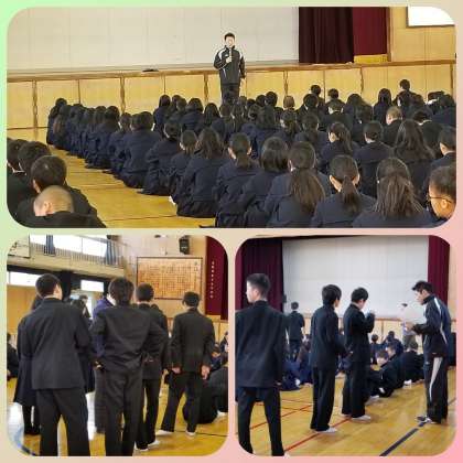 教員の講話では、3学期が始まり4日が過ぎた学年生徒の様子から、時間を守り、元気な声であいさつするなど、生徒がたいへん充実した冬休みを送っていたと評価されていました。また改めて、初心を大切にするようにと指導されていました。