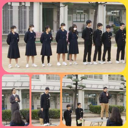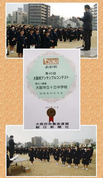 この日の集会では、吹奏楽部の年末に開催された大阪府アンサンブルコンサートにおける管打八重奏の『金賞』を表彰伝達しました。