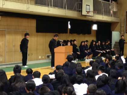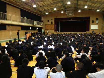 体育館の全校生徒は、みんな真剣に演説に耳を傾けていました。