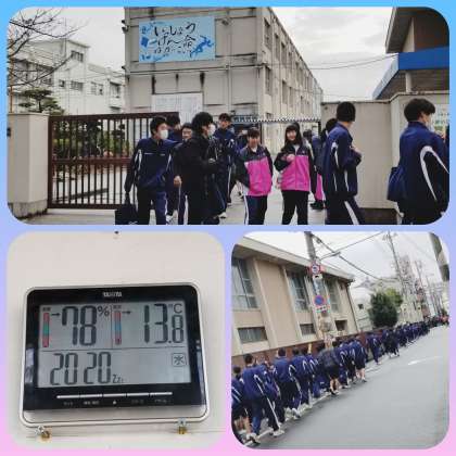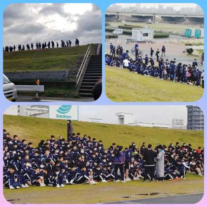学校を出発し、河川敷へ向かいます。踏切、信号などが多いですが、PTAの方々からの見守りもあり、全員9時30分に無事スタート地点に到着しました。