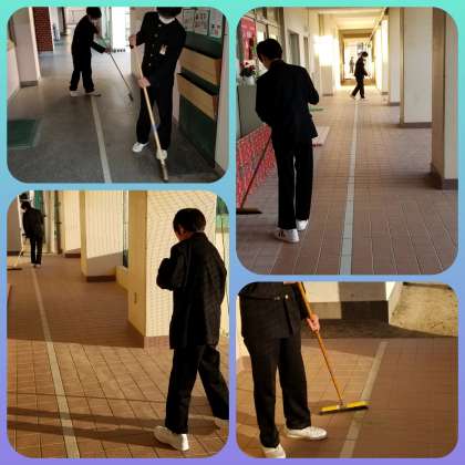 昨日学級清掃活動で割り当て場所として清掃は済んでいますが、運動場に面した廊下は風等で砂が広がる傾向にあります。
