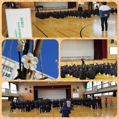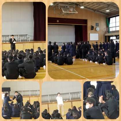 二年生学年集会、休み明けの少し気持ちの緩んだ生徒集団に大きな号令がかかります。