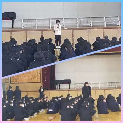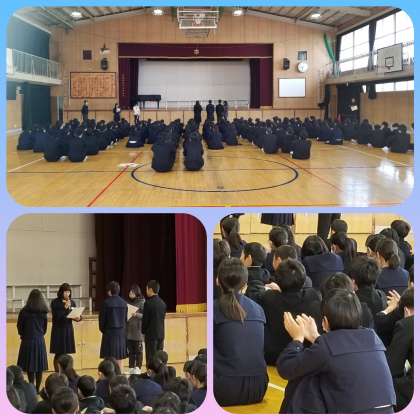 日か差し込み、意外と暖かな体育館で二年学年集会が行われました。