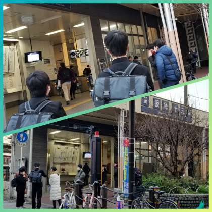 朝7時10分、三年生男子二人が十三駅前で乗車時間を待ちます。