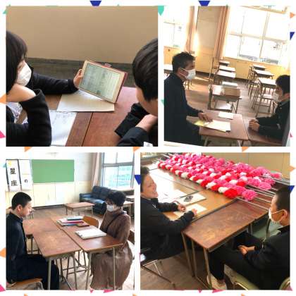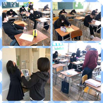 別室で教育相談、教室で修学旅行の取り組みなどを行います。2日続けて、みんなの楽しそうな顔が見られて、とても安心しました。担任の先生方ともゆっくり話し、データを見ながら進路についての相談をしている人もいました。3年生になるという自覚が少しずつ出てきたでしょうか。