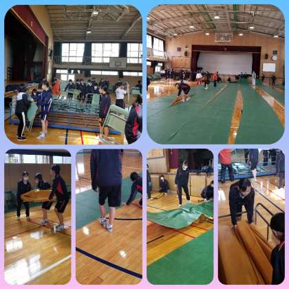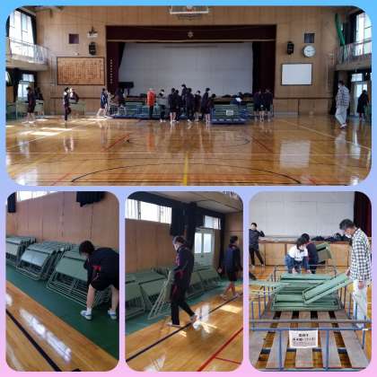 式場についても、先生の指示のもと段取りよくシートや椅子が整然と並べられました。また、一年教室には教科書が各生徒の机に準備されました。