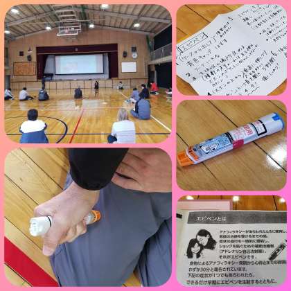 食物アレルギーによるアナフィラキシーの悲劇を起こさないように、教職員全員が参加し、映像と練習用のエピペンを使っての研修です。