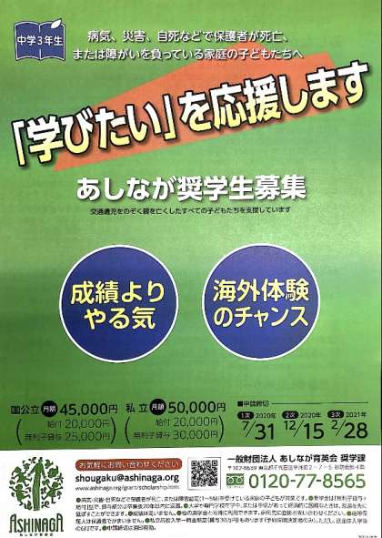 もっとも早く締め切りとなるのは、2番の川口交通遺児育英会で、6月30日までです。申請をお考えの場合、学校までご相談ください。よろしくお願いいたします。