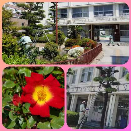 校内では、管理作業員さんが高木などの枝を剪定していました。これからの強い日差しでますます木々が大きく育っています。栄養が行き渡り、見映えもよく、生徒の安全のためにも大切な剪定作業です。