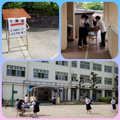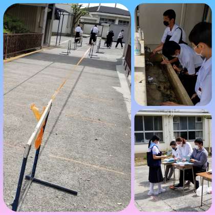 晴れた日なので、運動場や中庭に受付を設け、健康観察を行います。