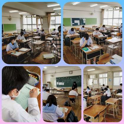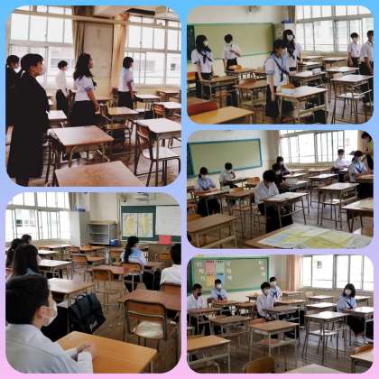 一年生の教室、学活前、間隔を開けた約10人の生徒が自席で静かに学級担任を待っています。