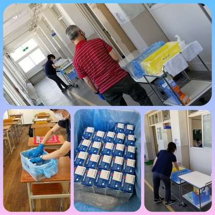 11時30分頃より学級前では、教員たちが消毒を行い、パンと牛乳を運び入れます。