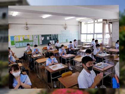 3限授業終了後、生徒たちが手洗いを行っている間に、ランチョンマットにパンと牛乳が準備され、アルコールで手指消毒を行います。このような安全対策を取ったうえで、『いただきます』