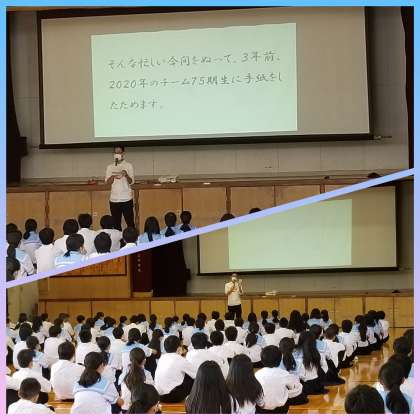 学年主任から、3年後の75期生へあてた手紙を紹介。
