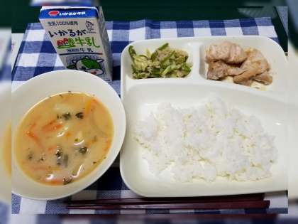 18日(木)の給食は、『鶏肉のおろしじょうゆかけ』と野菜炒めでした。