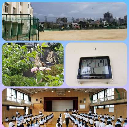 雲の間から青空が覗く蒸し暑い朝です。職員室前の気温計は、朝から29度を示しています。