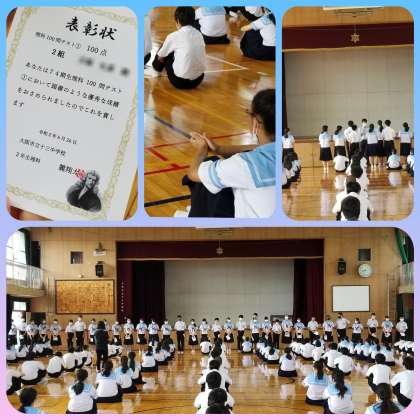 二年生集会では、理科の100問テストの表彰が行われていました。