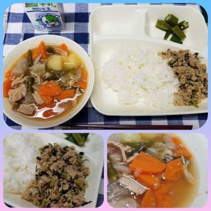 本日の給食は野菜たっぷりの『豚肉とじゃがいいもの煮もの』と『オクラ』、『ツナっ葉いため』でした。