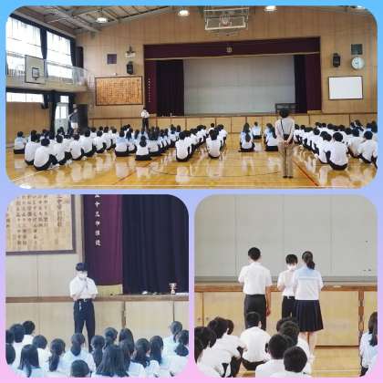 生徒の進行による集会、慣れたものです。整列、点呼等たいへんスムーズに進められています。