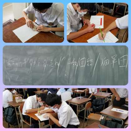 拡大した文字に色を付け、目立つようにします。また、別の生徒は色紙を使い、鶴でしょうか、夢中です。