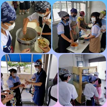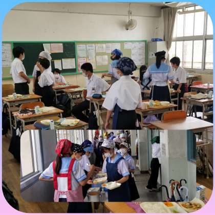 一年生教室では、係生徒が忙しく配膳を行っています。