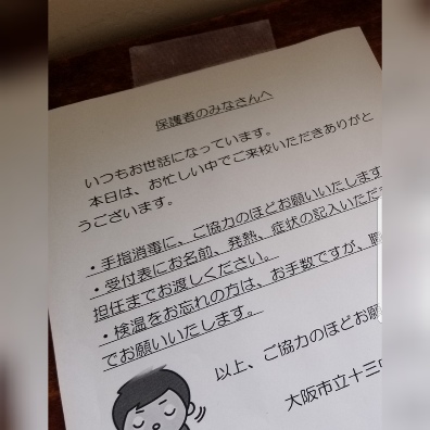 感染症対策として、教室前でアルコール消毒を始め体温等の健康状況を確認させていただいております。