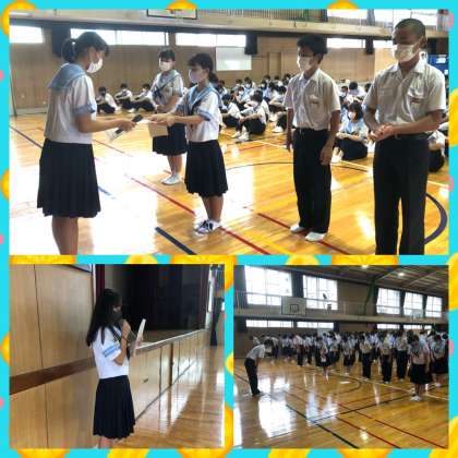 本日朝は3年生の学年集会。梅雨明け間近、セミの鳴き声が響き渡る中での集会となりました。