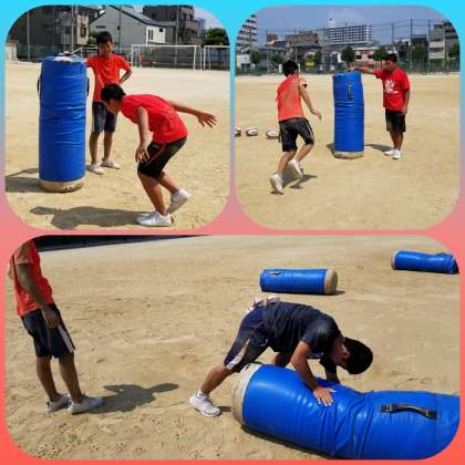 炎天下で砂まみれになりながらタックル練習を繰り返すラグビー部員。