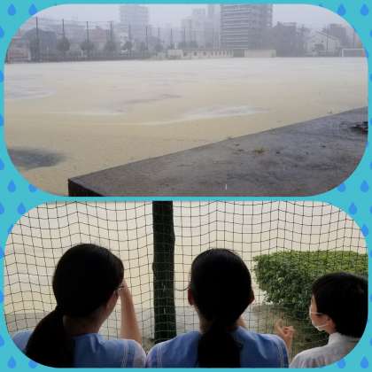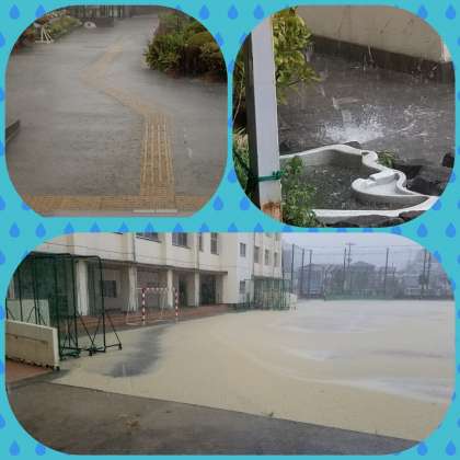 午後2時20分、下校する生徒の前に激しい雨と雷で、足止めを食らう生徒たち。瞬く間に運動場が雨で覆われました。