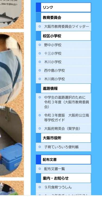『リンク』では、教育委員会をはじめ、校区小学校、進路情報、大阪市役所のリンクがあります。