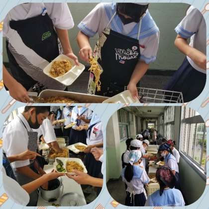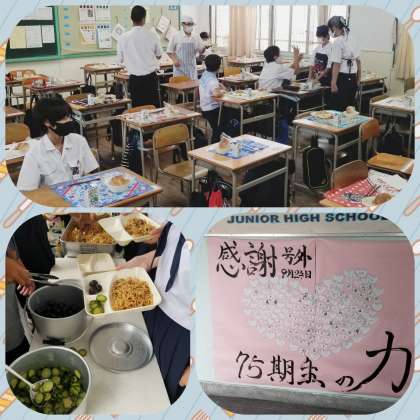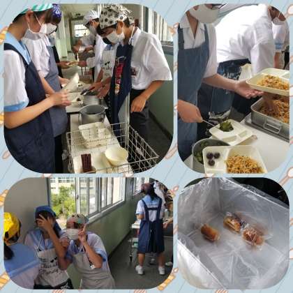 一年生、給食準備では、係生徒が手際よく器に焼きそば、きゅうり、ぶどうをよそっていきます。